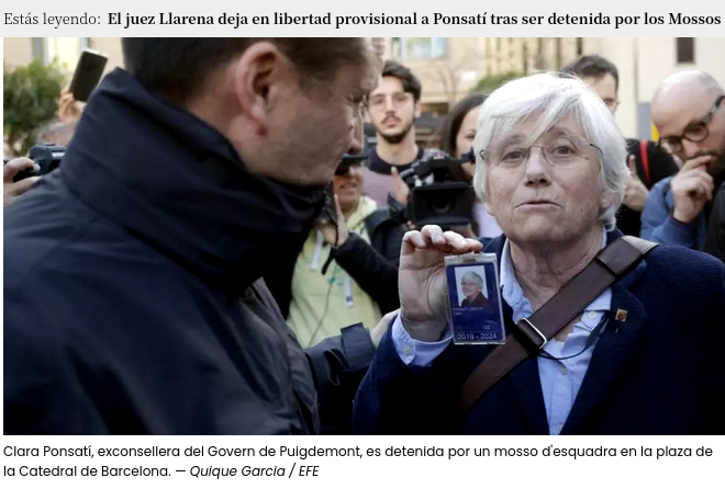 Clara Ponsati, già ministro del governo presieduto da Carles Puigdemont ai tempi del referendum dell'indipendenza catalana del 1 ottobre 2017, perseguitata da allora insieme allo stesso presidente e a molti altri, è stata arrestata, sia pure per poco, al suo primo ritorno in patria dopo cinque anni di esilio. Questi arresti di indipendentisti catalani, peraltro, non sono più una novità, grazie alle pesanti barbariche falle giuridiche del sistema dei mandati di arresto europeo.