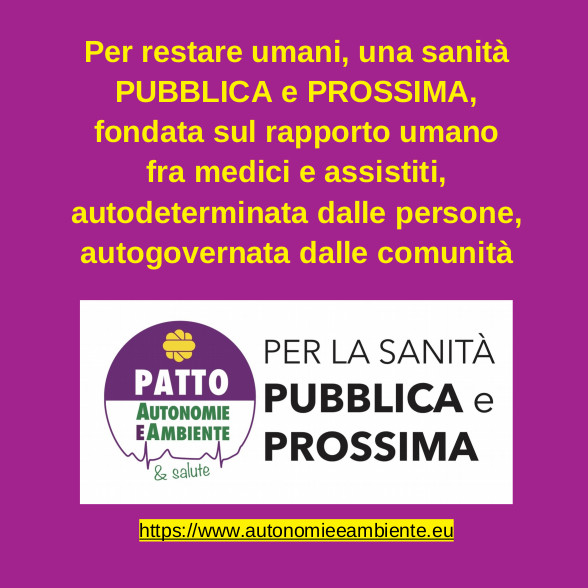 1 La sanità, secondo il Patto Autonomie e Ambiente, deve essere pubblica e prossima, per la salute di oggi e il bene delle generazioni future.