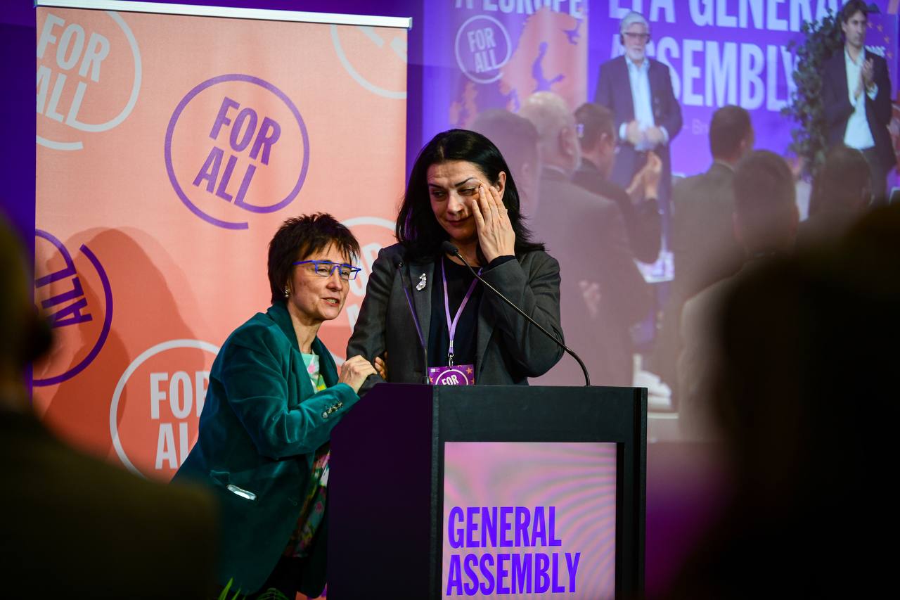 Nella foto la presidente EFA, la dottoressa Lorena Lopez, vicino ad Armine Alexanian, esponente in esilio del Partito Democratico dell'Artsakh (forza sorella in EFA, https://twitter.com/DPA_Artsakh).