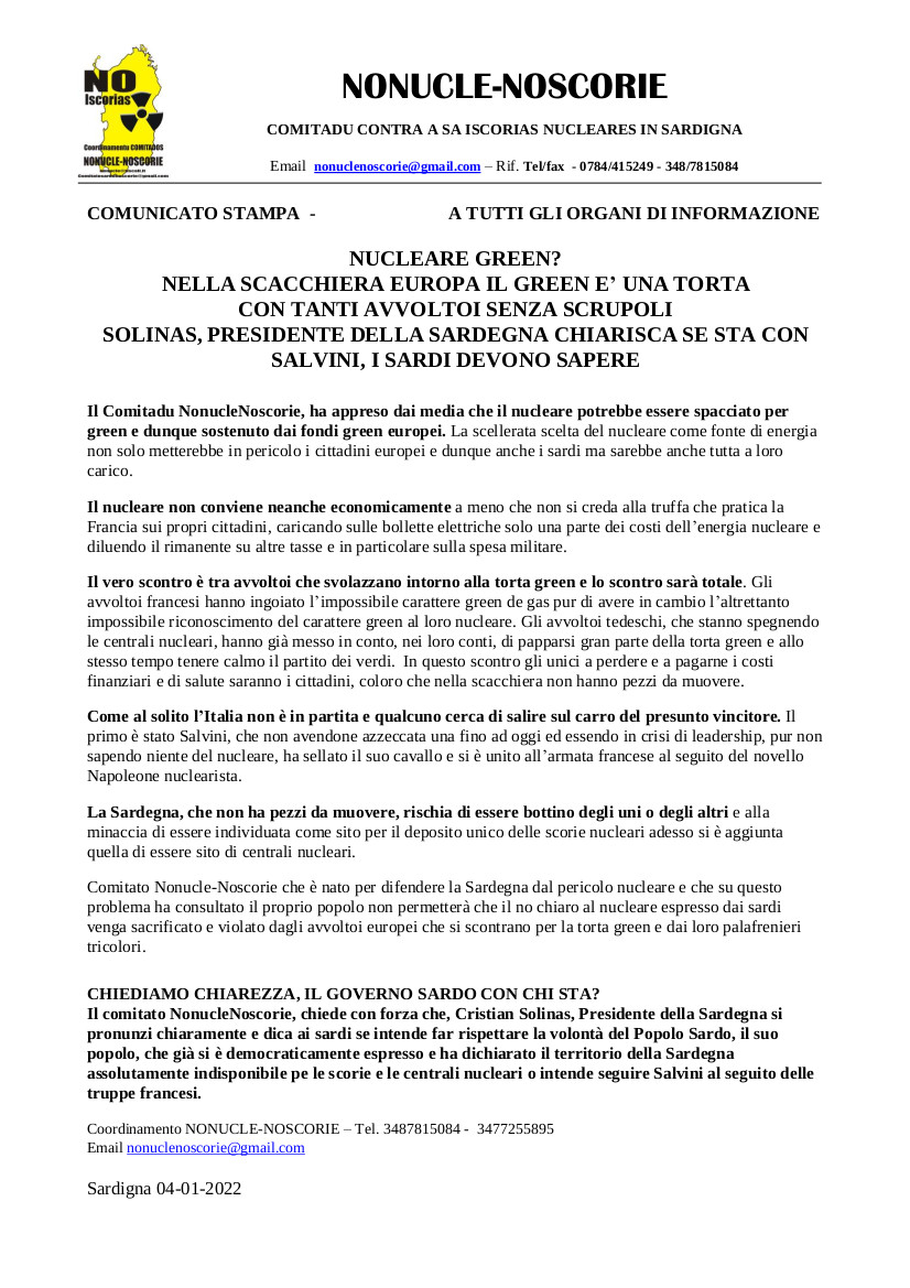 Abbiamo ricevuto dal Comitato NoNucle-NoScorie della Sardegna (COMITADU CONTRA A SA ISCORIAS NUCLEARES IN SARDIGNA) una denuncia dei gravissimi problemi posti dal riaffacciarsi del dibattito sul nucleare nella Repubblica italiana. Esprimiamo la nostra solidarietà e lo pubblichiamo integralmente qui.