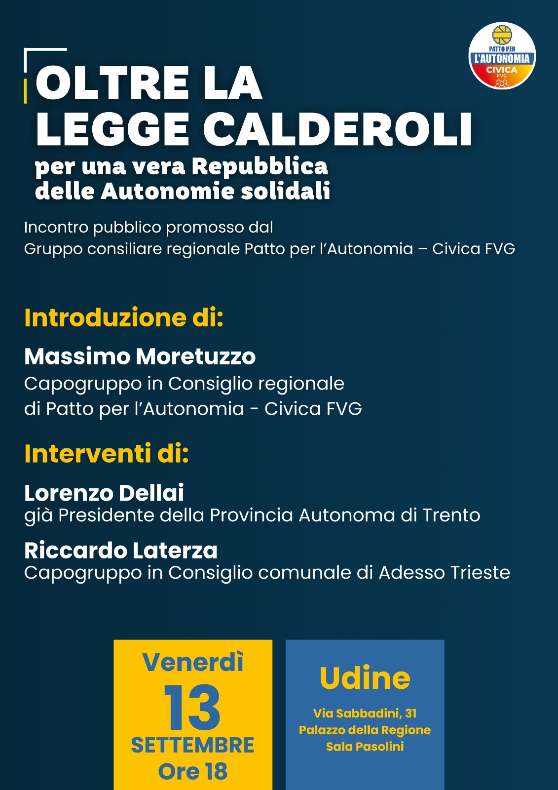 A Udine il 13 settembre 2024, allre ore 18, nella Sala Pasolini della regione, in Via Sabbadini 31, si tiene l'incontro pubblico sul tema OLTRE LA LEGGE CALDEROLI per una vera Repubblica delle Auto…