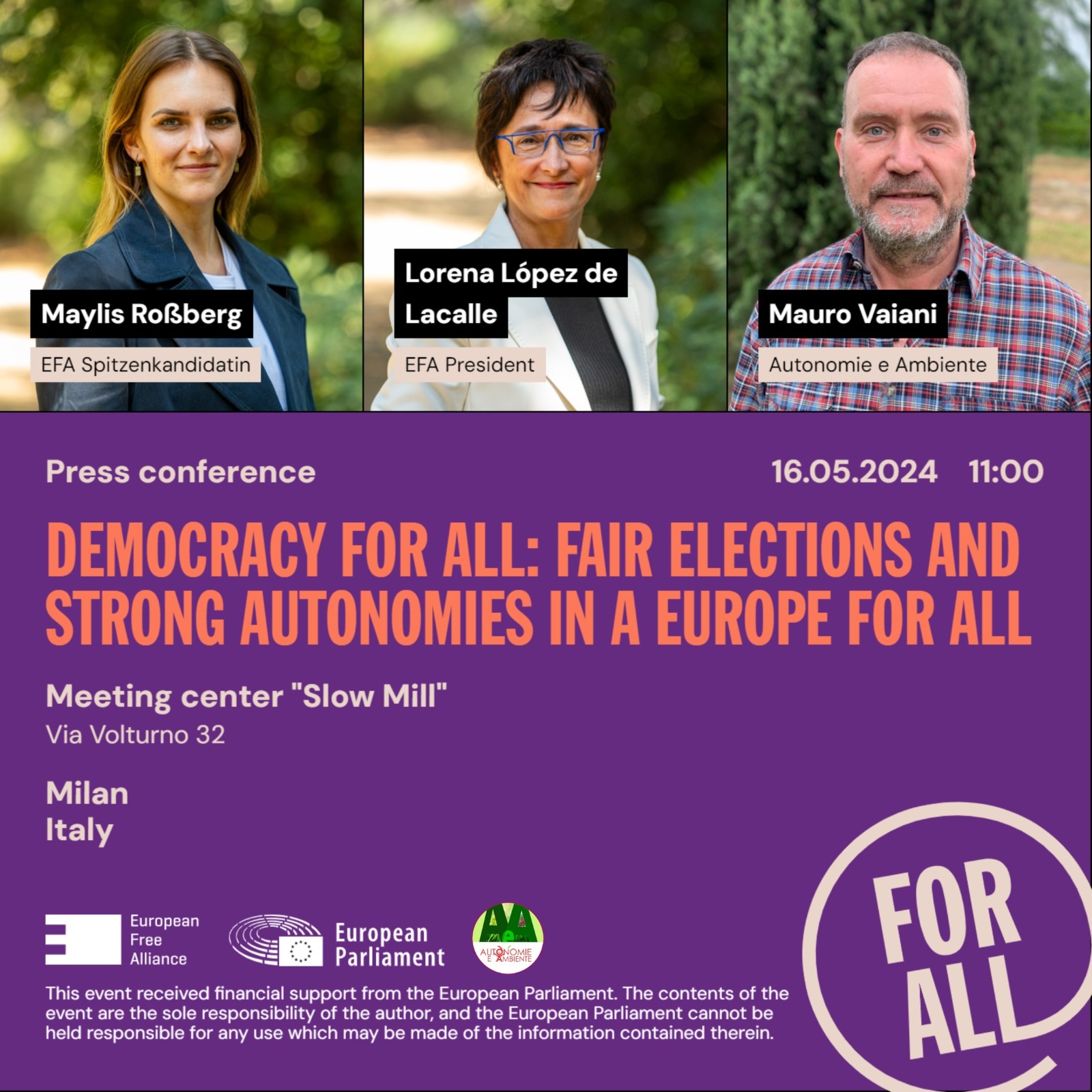 European Free Alliance e Autonomie e Ambiente a Milano il 16 maggio 2024 DEMOCRAZIA PER TUTTI: ELEZIONI CORRETTE ED AUTONOMIE FORTI IN UN'EUROPA PER TUTTI Dove: Centro Slow Mill (www.slowmill.it -…