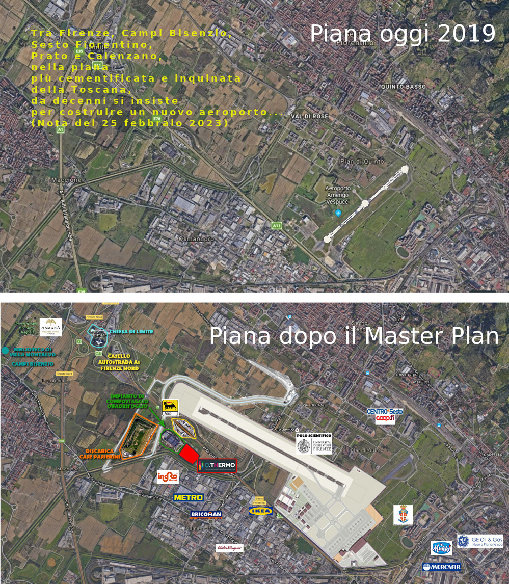 Spiace, quindi, prendere atto che da decenni va avanti una incomprensibile "novella dello stento" sulla costruzione di un nuovo aeroporto a Peretola, alle porte di Firenze. Come si vede dall'immagine (risalente al 2019) pubblicata a corredo di questo intervento, il "master plan" della nuova pista comporterebbe un investimento enorme e stravolgerebbe la vita della grande piana di Firenze-Prato-Pistoia, la quale è già, peraltro, la più cementificata e inquinata della Toscana. Già oggi la vita di almeno 800.000 residenti della Piana toscana è difficile, insieme con quella di altre centinaia di migliaia di Toscani che vi si recano ogni giorno per lavoro. Se venissero aperti i cantieri di questa opera faraonica, si rovinerebbe definitivamente l'abitabilità di questo territorio per generazioni.