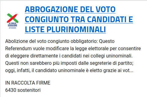 ✏️ “ABROGAZIONE DEL VOTO CONGIUNTO TRA CANDIDATI E LISTE PLURINOMINALI” (il numero dell’iniziativa è 500004) https://pnri.firmereferendum.giustizia.it/referendum/open/dettaglio-open/500004
