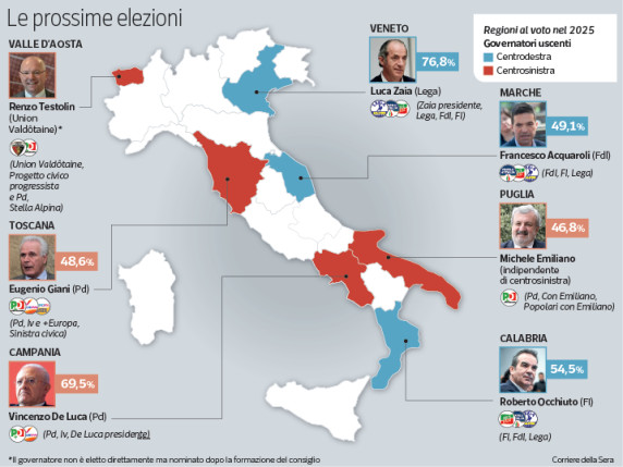 Con l'eccezione della Valle d'Aosta, dove vigono regole più democratiche, le imminenti elezioni regionali di fine 2025 in sei regioni italiane (Veneto, Marche, Toscana, Campania, Puglia, Calabria) sono già state trasformate dal conformismo mediatico in altrettanti plebisciti fra le due principali piramidi che dominano la vita politica nella Repubblica, centrodestra e centrosinistra.