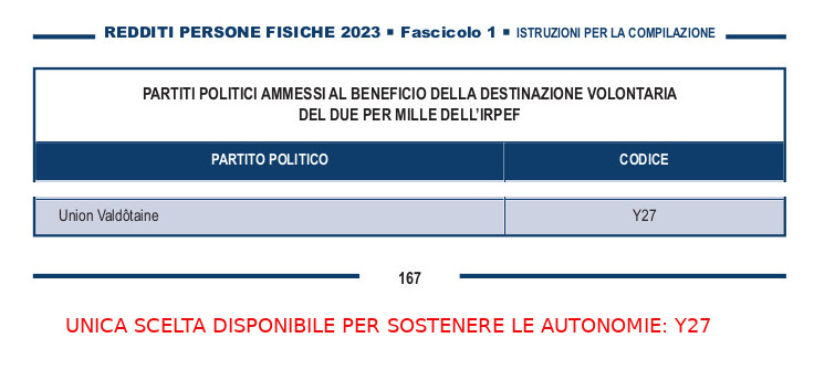 Fra i poco più di due milioni di cittadini che, nonostante tutto, confermano fiducia a una organizzazione politica, ci sono anche gli oltre seimila contribuenti che scelgono la sigla Y27, quella della storica Valdôtaine, unica fra le nostre forze sorelle EFA che, grazie alla sua rappresentanza parlamentare, compare nell'elenco dei partiti finanziabili. Da notare che migliaia di attivisti delle autonomie sostengono la Union pur non essendo residenti della Valle d'Aosta, come si può vedere da questa tabella: